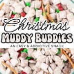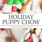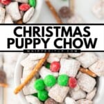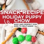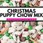 This Christmas puppy chow recipe was adapted from my peanut butter chocolate muddy buddies recipe.